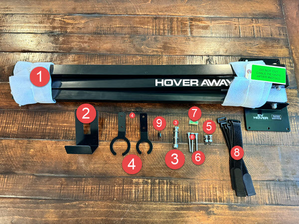 Carefully unpack the Hover Away box and confirm you have received all the parts and tools, and they have not been damaged during transit. Contact Hover Away Customer Support if you find anything damaged from shipment, before installation.