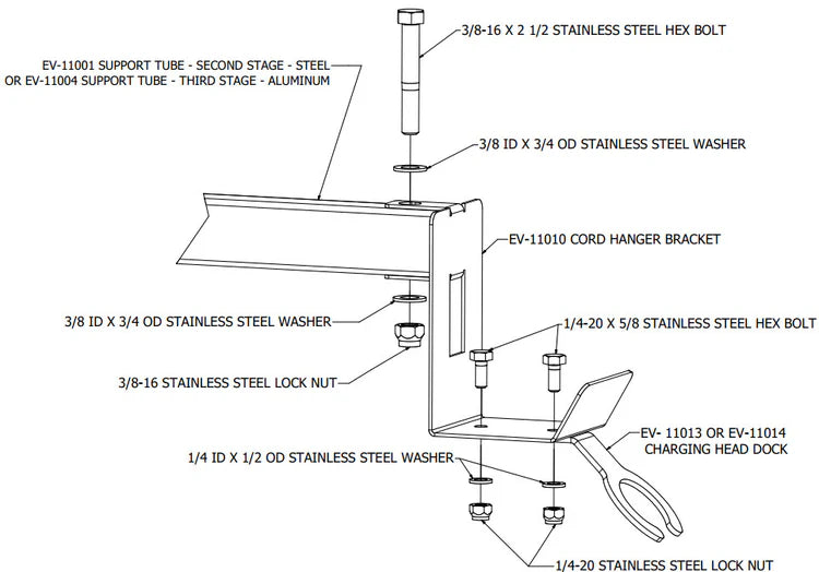 A. Thread the Stainless Steel Hex Bolt [3] through a Stainless Steel Washer and then through the Hook [2] (after attaching it to the end of the Hover Away). Finish with another Stainless Steel Washer and secure with the Lock Nut. Tighten with a wrench, then install the screw cap on the end.